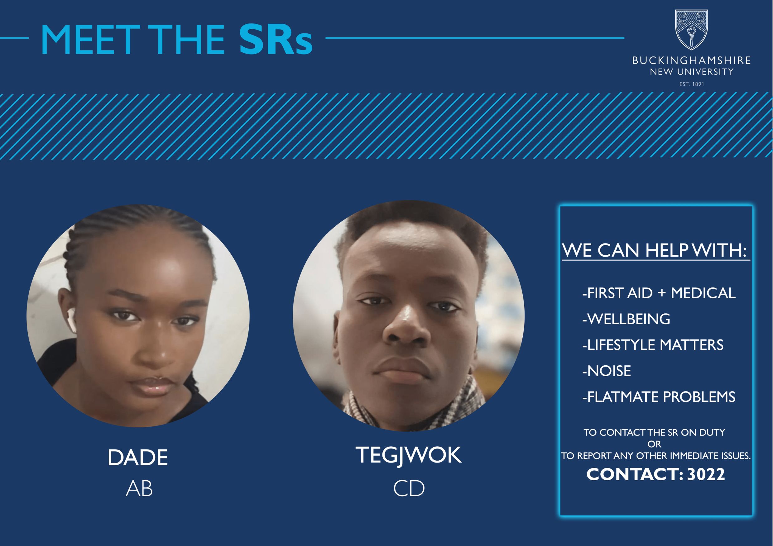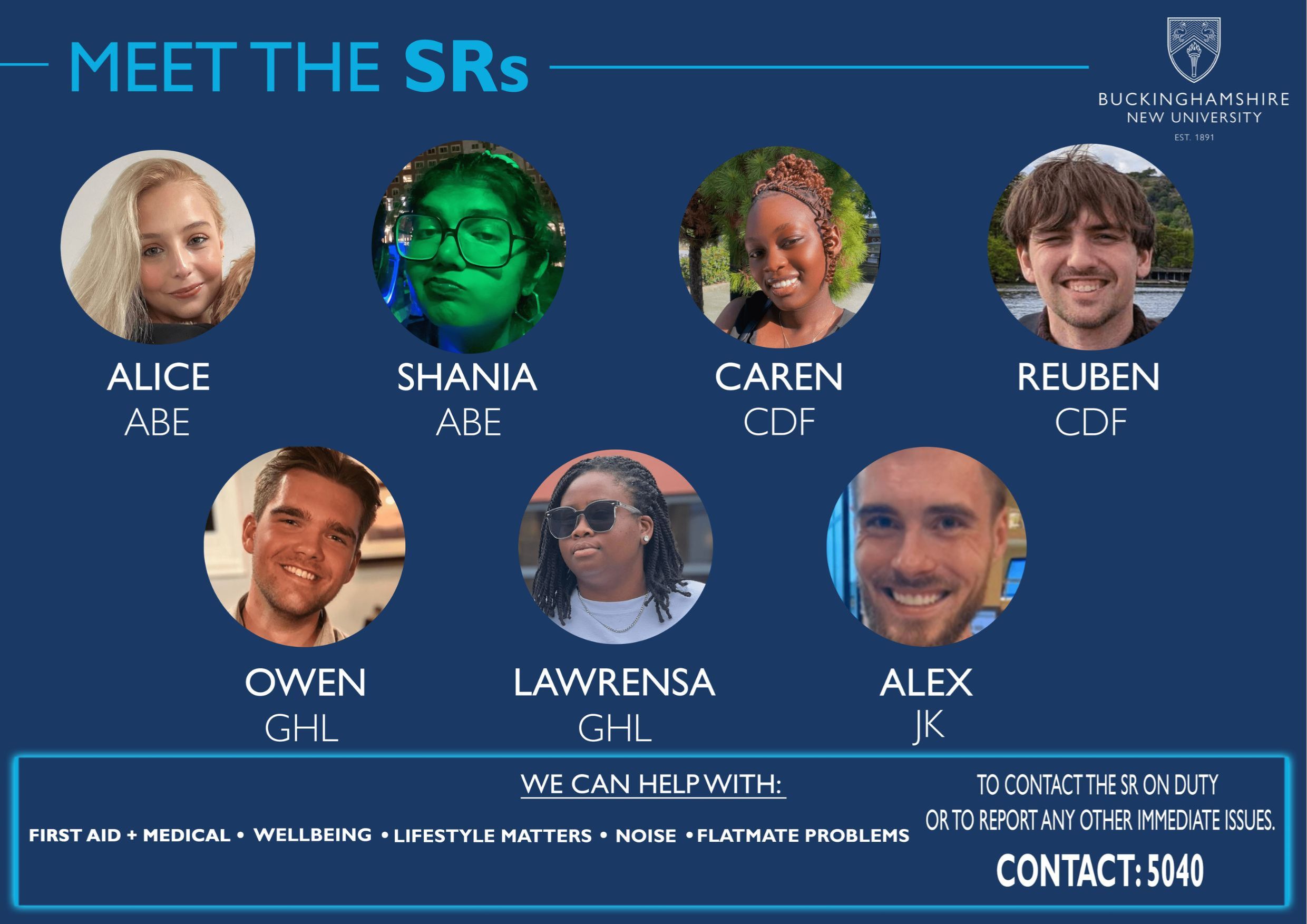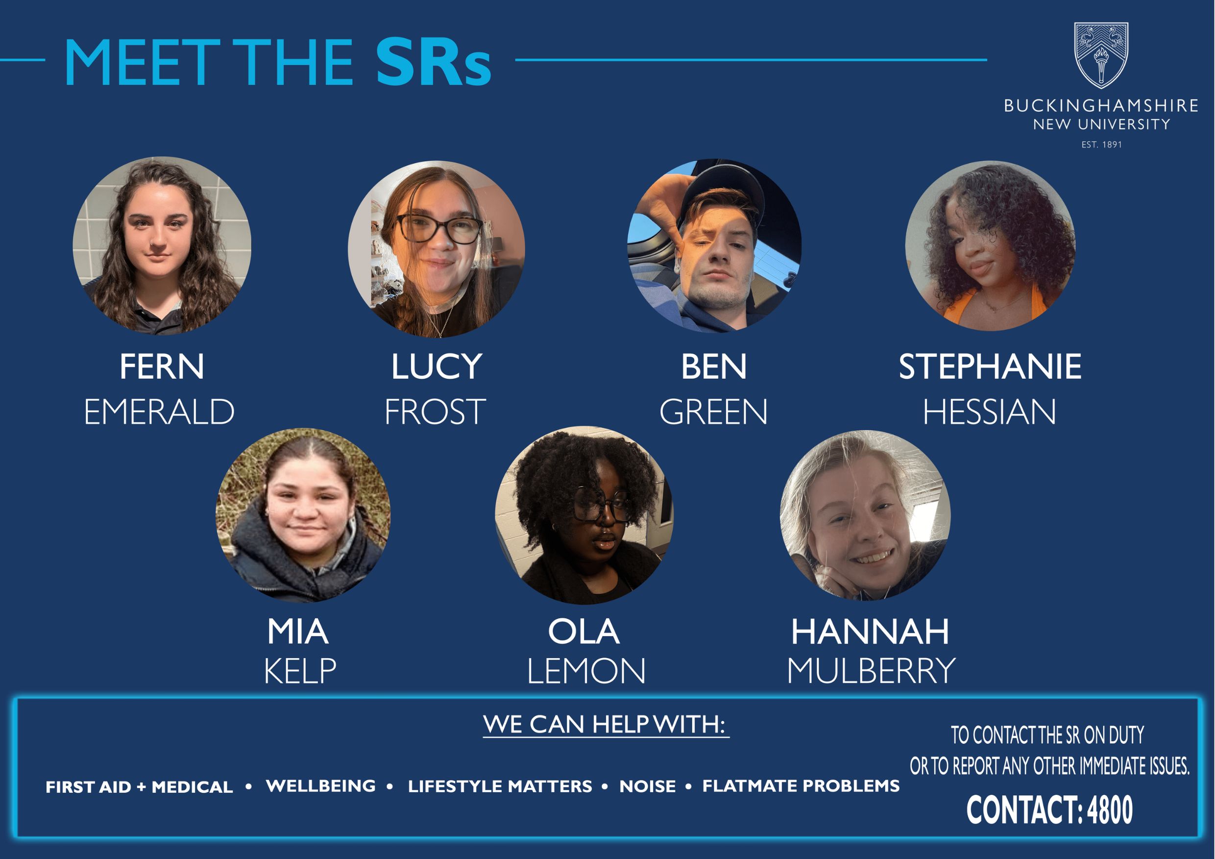 Across our halls of residence, we have Senior Residents (SR). SR's are current students who assist students in halls with first aid and medical advice, wellbeing, lifestyle matters, noise and flat mate problems. Meet the Senior Residents at our Brook Street, Hughenden Park and Windsor House halls of residence.